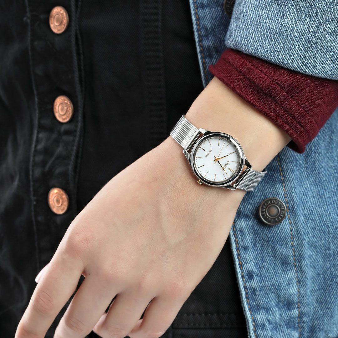 ساعت مچی سیتیزن مدل EM0504-81A ساعتی مناسب برای خانم ها بوده و با توجه به جنس بند استیل مناسب برای استفاده رسمی,روزمره است. باتوجه به مقاومت در آب ۵۰ متر این ساعت مناسب برای شست و شوی روزمره و استحمام است.
