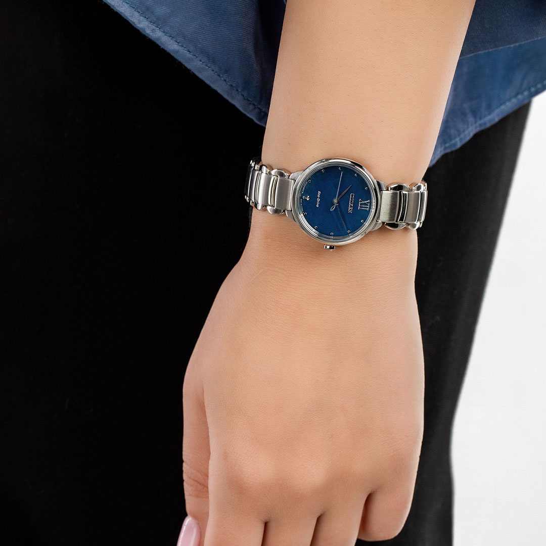 ساعت مچی سیتیزن مدل EM0920-86L ساعتی مناسب برای خانم ها بوده و با توجه به جنس بند استیل مناسب برای استفاده رسمی,روزمره است. باتوجه به مقاومت در آب ۵۰ متر این ساعت مناسب برای شست و شوی روزمره و استحمام است.