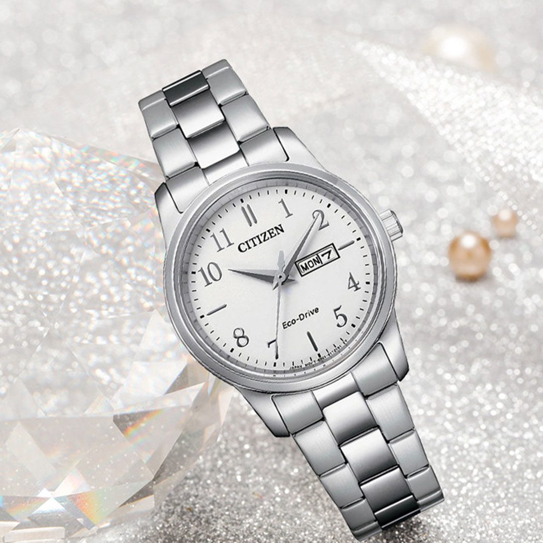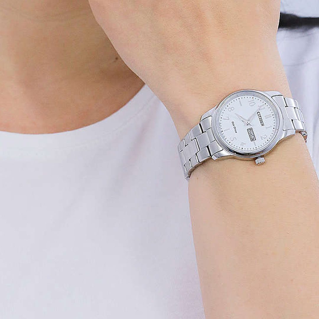 ساعت مچی سیتیزن مدل EW3260-84A ساعتی مناسب برای خانم ها بوده و با توجه به جنس بند استیل مناسب برای استفاده رسمی,روزمره است. باتوجه به مقاومت در آب ۱۰۰ متر این ساعت مناسب برای استفاده در استخر و غواصی تفریحی است.