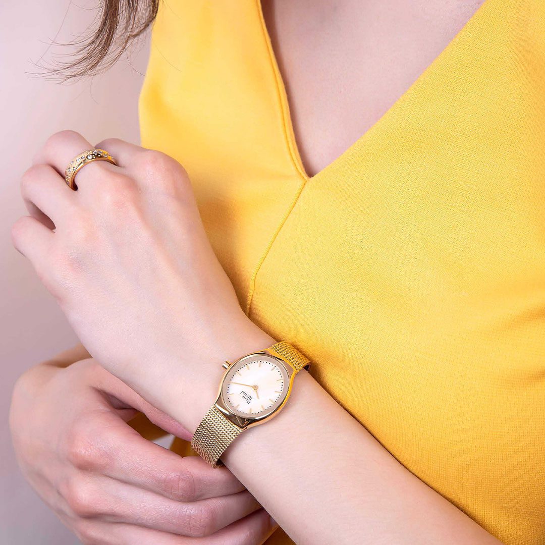 ساعت های زنانه: مجموعه زنانه شامل طرحهای شیک و شیک است، با گزینههایی که عناصر تزئینی مانند کریستالها و صفحههای مروارید را در خود جای داده است.